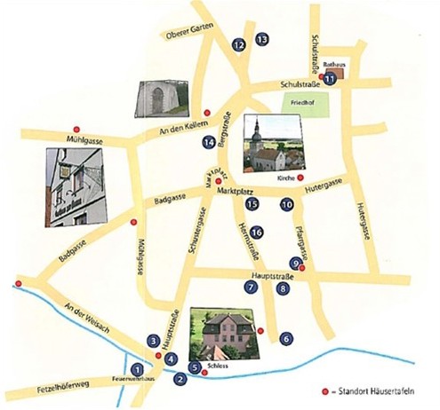 Die Ortsführung beginnt auf dem Platz vor dem Feuerwehrhaus, der früher "Kollnblattn" genannt wurde. Wir gehen nach links ein Stück am "Booch" -der Kleinen Weisach-entlang und gelangen auf die Mühlgasse. Dort werfen wir einen Blick auf die Häuser Mühlgasse 7, Mühlgasse 9 und Badgasse 10 auf der linken Straßenseite, bevor wir und nach rechts wenden und die Häuser Badgasse 6 und Badgasse 4 betrachten.