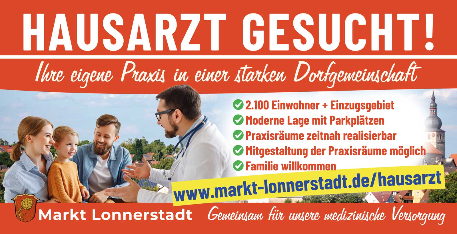 Die Marktgemeinde Lonnerstadt sucht eine engagierte Hausärztin oder einen engagierten Hausarzt zur Niederlassung. In unserer lebendigen Dorfgemeinschaft mit rund 2.100 Einwohnern erwartet Sie eine sichere Patientenbasis, moderne Rahmenbedingungen und die Möglichkeit, Ihre eigene Praxis aktiv mitzugestalten.